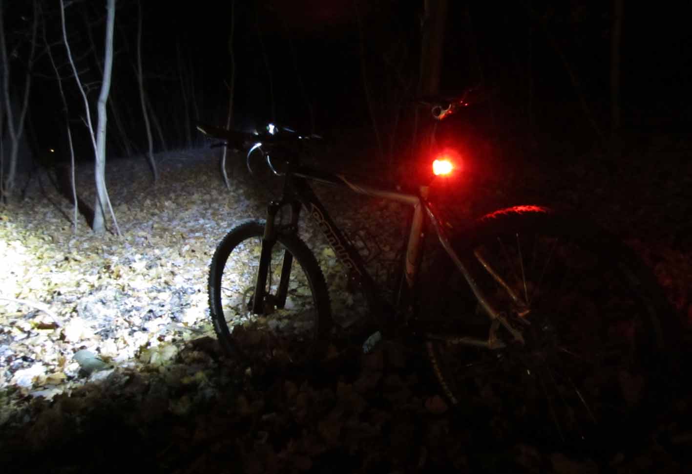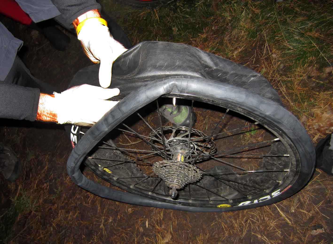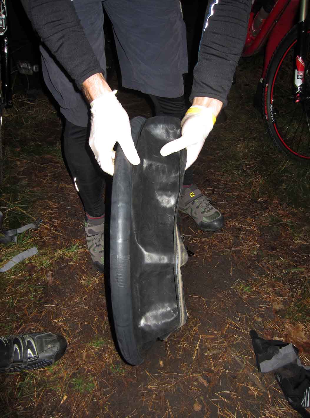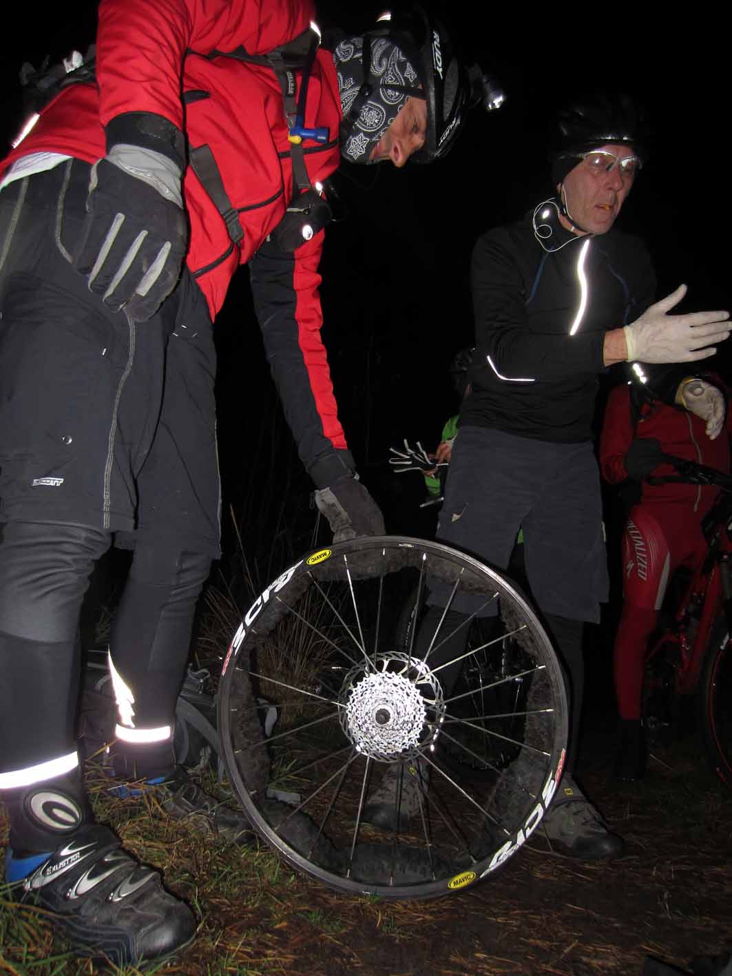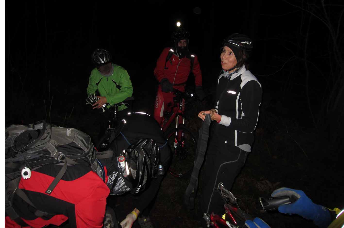Kurz nach 18:00 setzten wir uns in Bewegung, kamen allerdings nur wenige Kilometer, als Susanne "PANNE" rief. Ein Wort, dass keiner gerne hört, schon gar nicht im stockfinsteren Wald. Künstliche Sonne war genügend da, und der hintere Schlauch relativ schnell gewechselt.