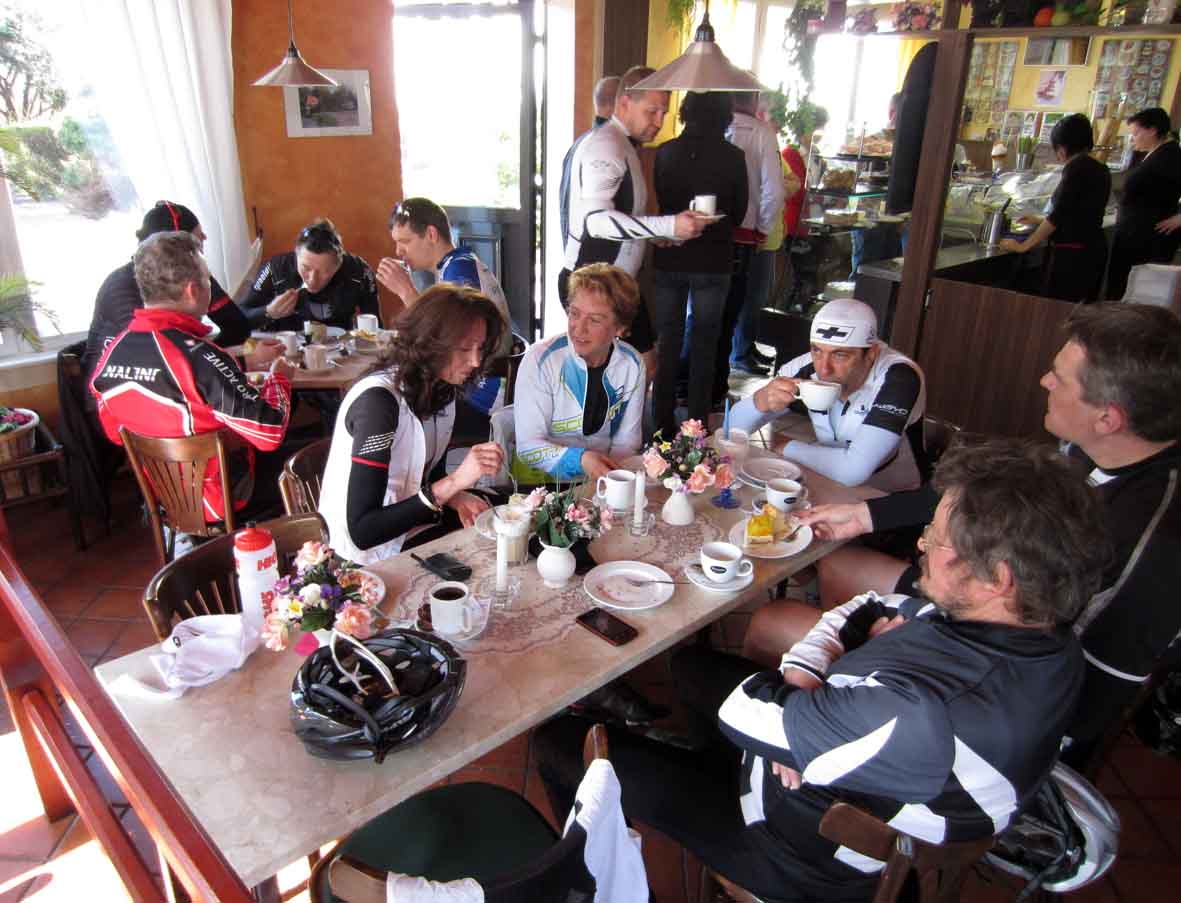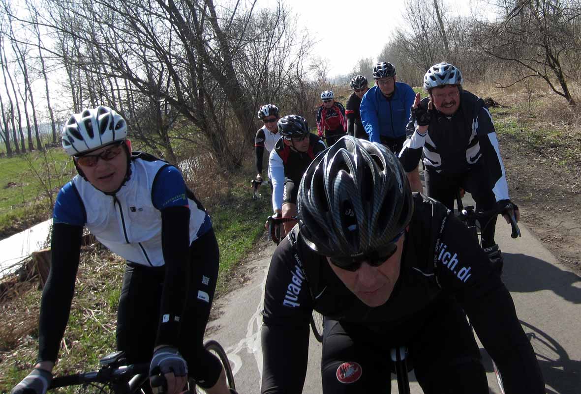 Kurze Begrüßung und die Gruppe setzte sich in Richtung Fehrbellin in Bewegung. Die Wechsel klappten gut und harmonisch, so kamen wir trotz des lästigen Gegenwindes gut voran. Über Nauen und Paulinenaue erreichten wir den Bäcker in Ferbellin in akzeptabler Zeit.